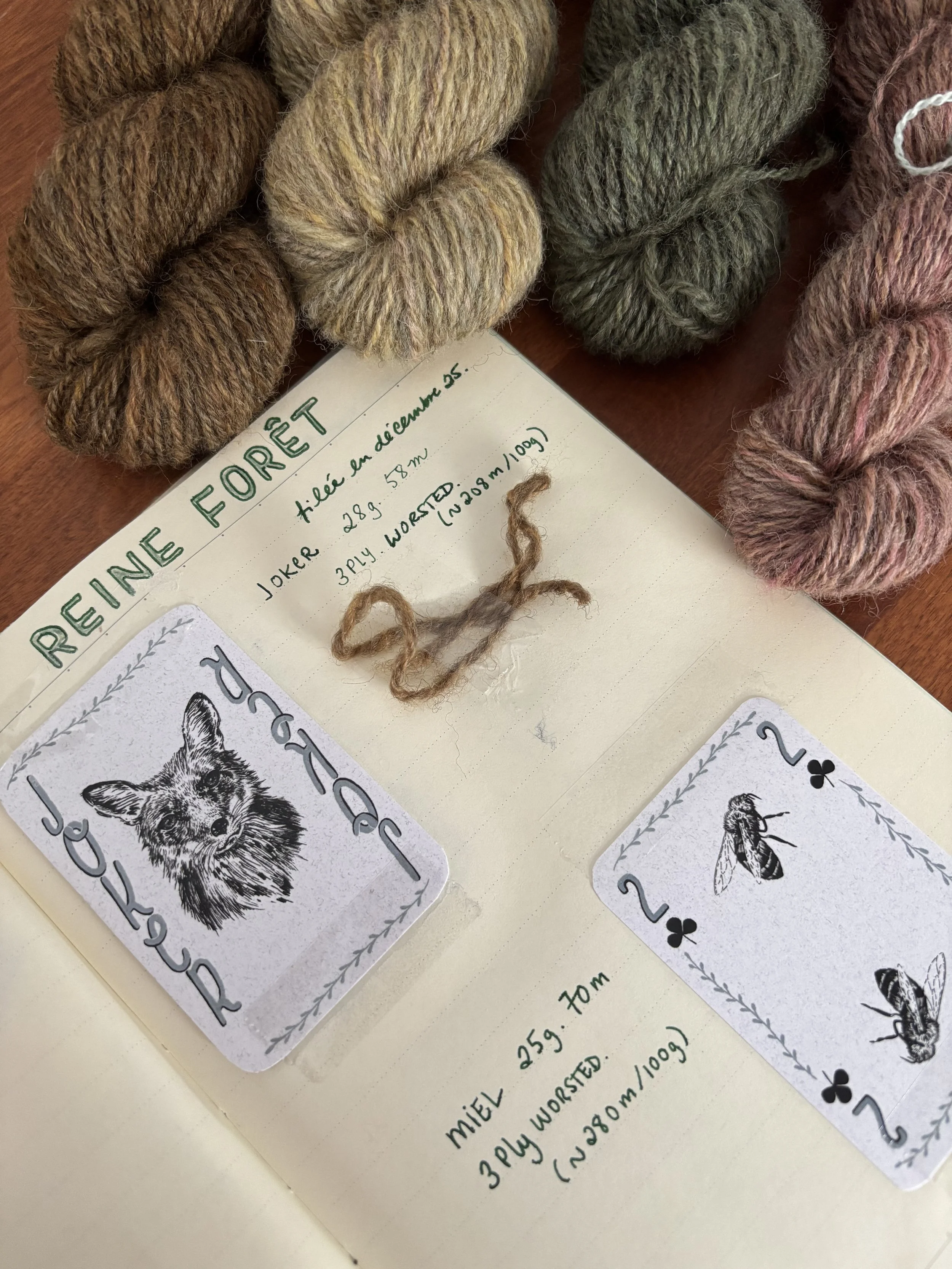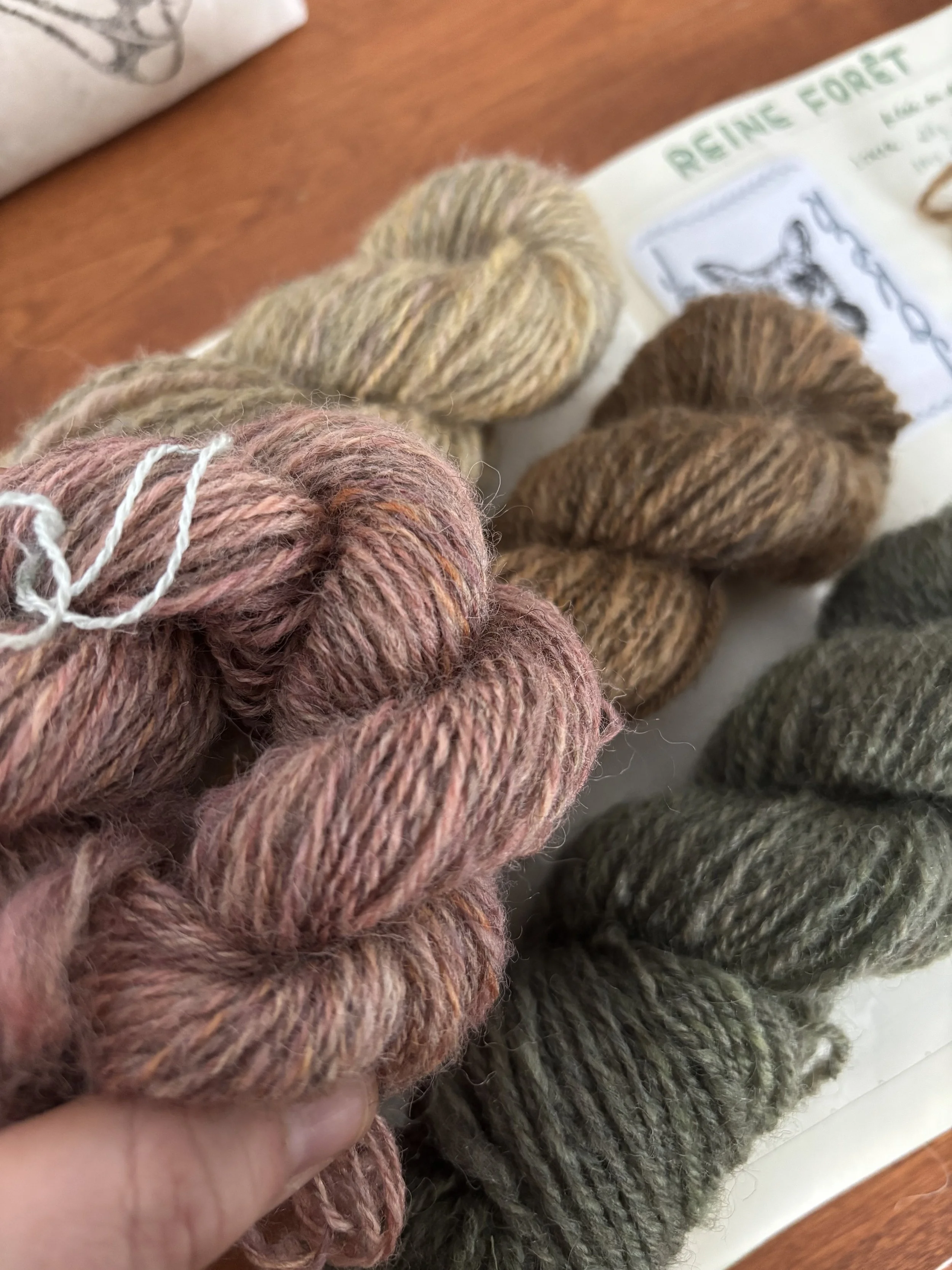 I'm also showing you my yarns from the Reine Forêt box so far. The first three are washed, and Quartz is freshly twisted and off the bobin but not yet washed. The difference is really noticeable, I think. I always wind my skeins into 150 cm diameter skeins. And I noticed that my three Reine Forêt yarns were 104 cm in diameter. Did I get the diameter wrong on the umbrella when I unwound them? Or is it possible they shrank that much in the wash?! I'll let you know…