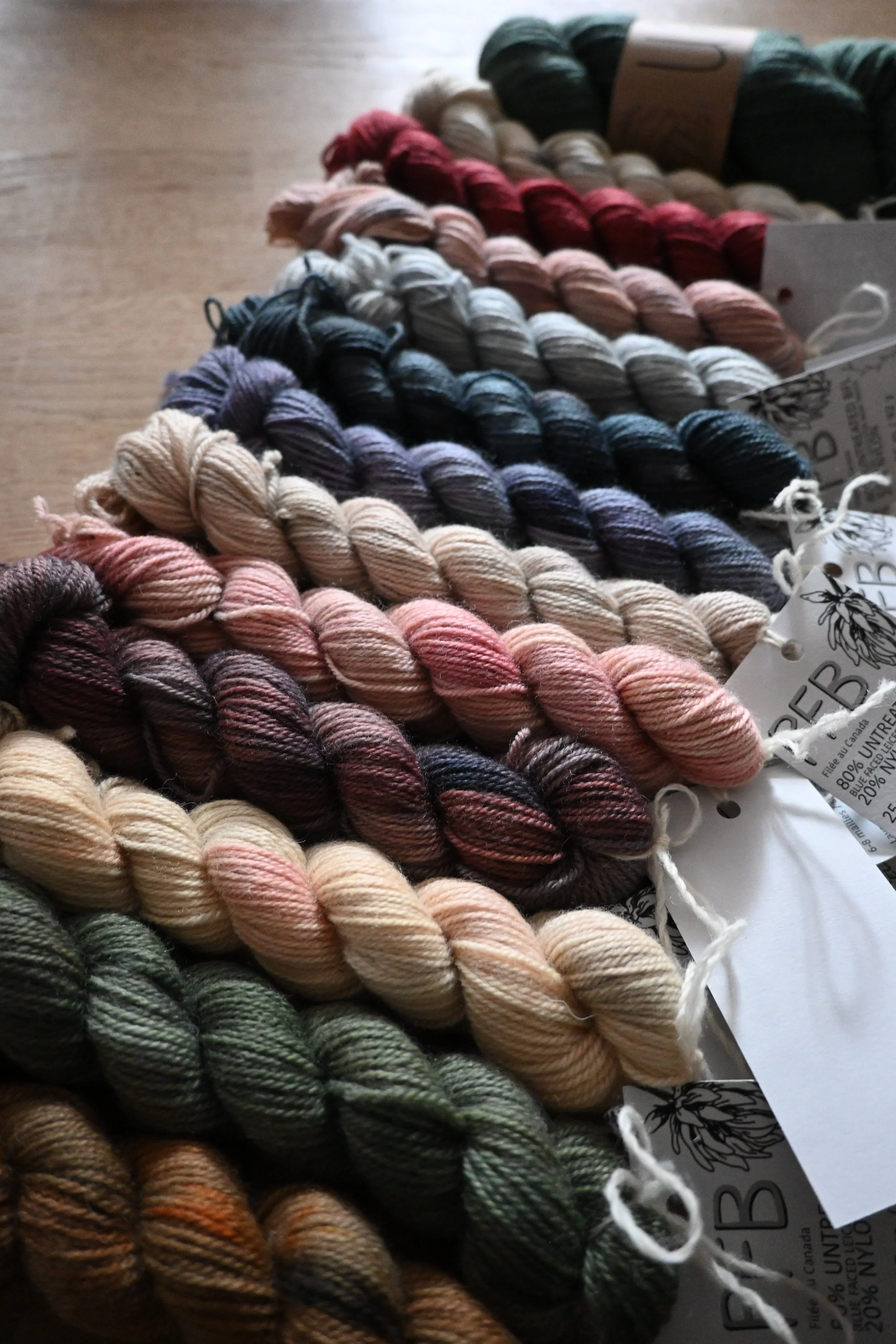 Dans les deux cas, les choix de fibres sont les mêmes. Pour la laine, j’ai choisi de garder la Urso PFB, mais on ajoute la John Arbon Exmoor Sock 4 ply. Des options idéales pour vos chaussettes, douces et laineuses à la fois. Les choix de fibres à filer sont au diapason, la fibre BFL non traitée, ou la fibre Exmoor Sock de chez John Arbon.